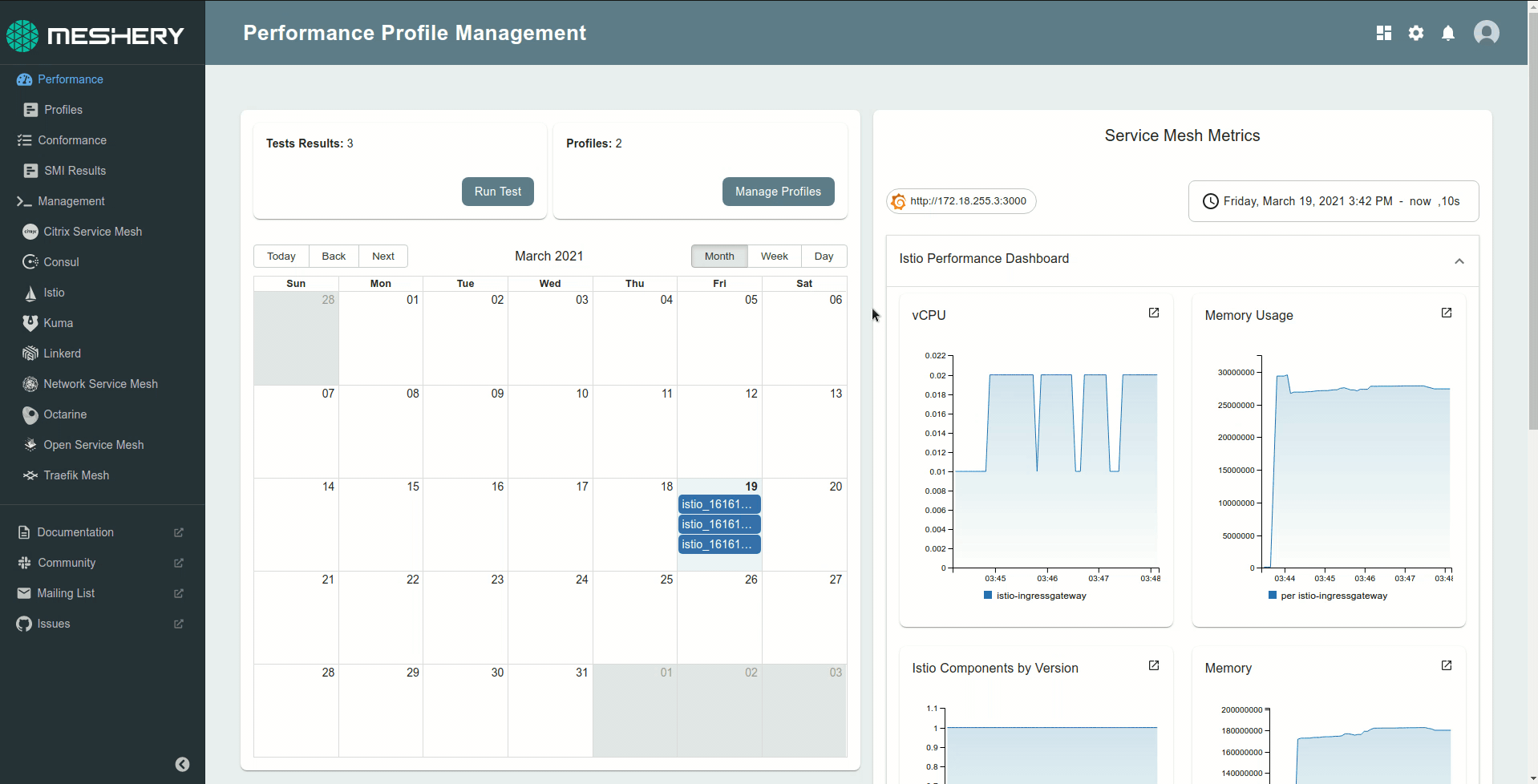 The results from the tests are updated on the Performance Management dashboard in Meshery. To learn more about interpreting the test results, check out this guide. You can always checkout the Meshery User Guides to dive deep into these features.